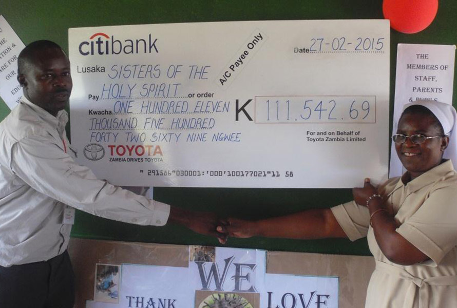 A cheque of $16,142 was presented to the school on 27th February 2015 towards the construction of a 1 x 3 classroom block, bringing the total spend by Toyota Zambia on this project to $29,113.