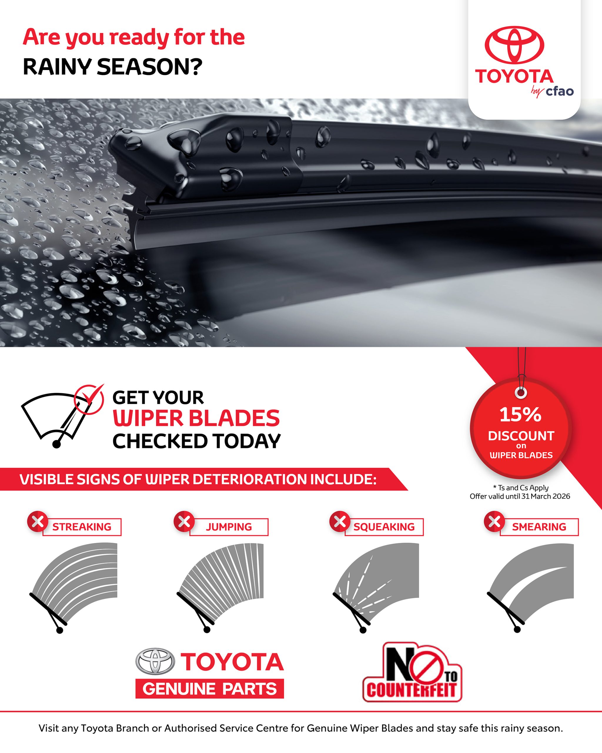 Take the required steps to ensure your wipers are properly working, that includes replacing the wiper blades and ensuring proper maintenance, which can be professionally done at any of our branches or authorised service centres.